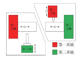 第一軸群的刀塔可與第二主軸一同加工;同時(shí)第一主軸借用第二刀塔加工降低機臺所需要的刀具數量,更靈活的加工應用,提升加工效率。