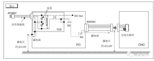 在發(fā)生漏電的情況下將RS232C電纜與CNC相連接時(shí),CNC側通信用IC因為過(guò)電壓有遭受破壞的危險。