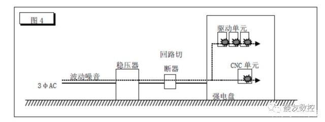 機床強電盤(pán)及穩壓器在沒(méi)有接地的狀態(tài)下,從電源線(xiàn)進(jìn)入強大的突波干擾,因其經(jīng)過(guò)機床強電盤(pán)的不特定路徑,CNC單元,驅動(dòng)單元等多臺機器出現故障的可能性將提高(圖4)
