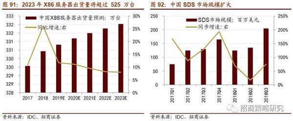 服務(wù)器和存儲等云計算產(chǎn)業(yè)鏈前端設施逐漸適應行業(yè)變革,國內云計算產(chǎn)能擴張已形成模式。根據IDC發(fā)布的全球服務(wù)器市場(chǎng)報告,我國服務(wù)器銷(xiāo)售額增速全球領(lǐng)先,低端X86占據服務(wù)器市場(chǎng)絕對優(yōu)勢,高需求帶動(dòng)服務(wù)器價(jià)格攀升,同時(shí)拉動(dòng)了服務(wù)器營(yíng)收增長(cháng)。2018 年全年中國 X86 服務(wù)器市場(chǎng)出貨量為3,304,300 臺,同比增長(cháng) 26.1%;市場(chǎng)規模為 171.89 億美元(約合人民幣1,151.95 億元),同比增長(cháng) 54.9%。IDC 預測,到 2023 年中國 X86 服務(wù)器出貨量將超過(guò) 525 萬(wàn)臺,未來(lái) 5 年整體市場(chǎng)年復合增長(cháng)率(CAGR)為 9.7%。
