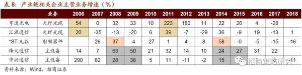 由于傳輸網(wǎng)的建設和無(wú)線(xiàn)網(wǎng)的建設存在時(shí)間差,傳輸網(wǎng)產(chǎn)業(yè)鏈的受益時(shí)間比無(wú)線(xiàn)網(wǎng)產(chǎn)業(yè)鏈的受益時(shí)間早,主設備受益時(shí)間持續時(shí)間較長(cháng)。傳輸網(wǎng)主要有光纖、光纜構成,因此光纖光纜產(chǎn)業(yè)鏈將在5G建設周期中首先受益。在運營(yíng)商資本傳輸網(wǎng)開(kāi)支達增速到峰值前一年,亨通光電和匯源通信的光纖光纜業(yè)務(wù)的營(yíng)業(yè)收入增速最快。無(wú)線(xiàn)網(wǎng)絡(luò )主要有射頻器件構成、主要包括濾波器、功率放大器、射頻開(kāi)關(guān)等射頻器件。在無(wú)線(xiàn)網(wǎng)資本開(kāi)支增速最快當年,國內射頻器件供應商*ST凡谷的主營(yíng)業(yè)務(wù)收入增速達到峰值。主設備供應商的業(yè)務(wù)增長(cháng)持續時(shí)間較長(cháng),峰值一般出現在牌照發(fā)放前后一年。