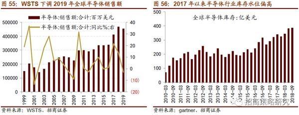 全球半導體行業(yè)庫存水位偏高,短期去庫存將影響半導體市場(chǎng)景氣度。2016年,全球存儲器行業(yè)處于上行周期,存儲器價(jià)格在2017年Q3達到了周期的高點(diǎn),三星、鎂光等存儲器巨頭紛紛擴充產(chǎn)能,導致存儲器供過(guò)于求,存儲器價(jià)格持續走低,拖累全球半導體市場(chǎng)。在2016年Q4之后,全球半導體存貨快速提升,2018年到超過(guò)350億美元,處于歷史較高水平。由于庫存較高以及需求不及預期,世界半導體貿易統計組織(WSTS)下調了全球半導體銷(xiāo)售額,將2019年全球半導體預計銷(xiāo)售額從4901.42億美元下調至4545.47億美元,同比增速也從增長(cháng)2.6%下調至下滑3%。
