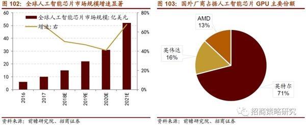 數據規模巨大和算法復雜度對芯片的要求越來(lái)越高,運算速度和穩定性成為芯片研發(fā)的關(guān)鍵指標。傳統的CPU芯片無(wú)法高效處理并行計算,且對不同的算法,芯片的設計要求也不同,定制化芯片應運而生。目前人工智能芯片市場(chǎng)仍被因特爾和英偉達等海外巨頭占據。據前瞻產(chǎn)業(yè)研究院統計,全球人工智能芯片2021年市場(chǎng)規模將達到52億美元,年復合增長(cháng)率達到53%。國內華為、寒武紀、阿里巴巴、比特大陸、百度等企業(yè)都在加速研發(fā)可定制化的AI芯片。其中寒武紀MLU 100PCIe 智能處理卡將于2019年量產(chǎn),比特大陸 SOPHON芯片計劃于2H19量產(chǎn)。