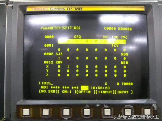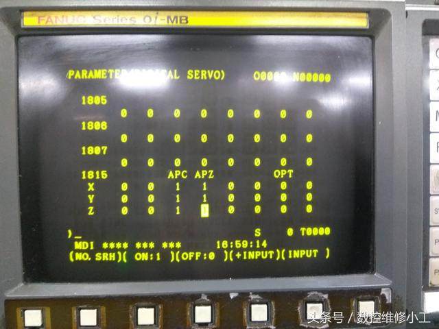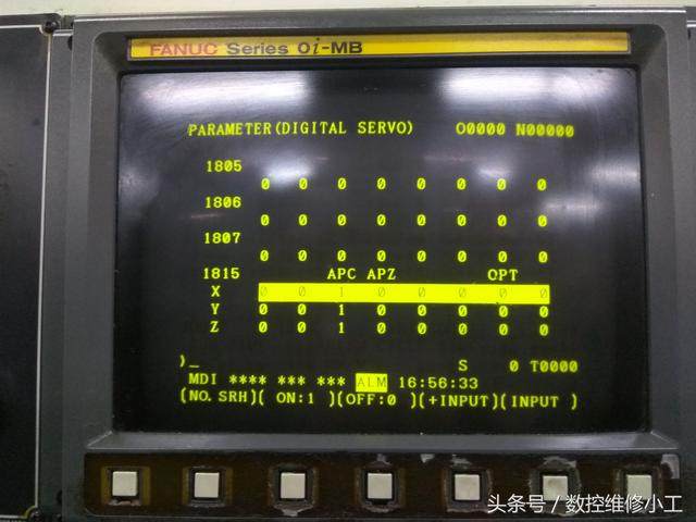四、按[SYSTEM]鍵,再按[PARAM]參數軟鍵,輸入[1815],再按[NO.SRH]搜索軟鍵,將光標移到1815 X#4即APZ那里,將APZ由原來(lái)的0改為1。Y、Z軸相同的操作。